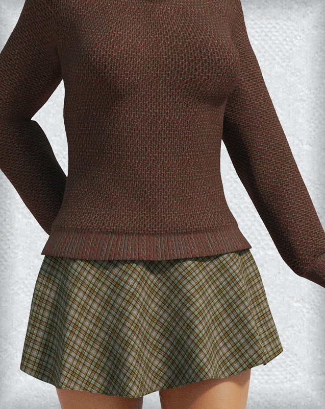 This might be worth a look if you want a nice sweater, shirt, or a short skirt. The New Semester Outfit is $5.93 (Daz Original) without having to buy anything. Here's a quickie to give you an idea of the materials.