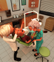 Another i3 product I got recently was the i13 Dental Office Interior. The set looks like a classic dental exam room, although it's a little odd in that it appears to be a combo of the examination equipment, office (desk and filing cabinet in one corner) and waiting room (row of chairs along one wall). The combo works OK from setting up scenes as you can position cameras to focus on the area of interest. Lots of details scattered throughout that give you the feel of a dental office. I decided this was a good setting for a little fun, so I used Toon Generations 2 figures.