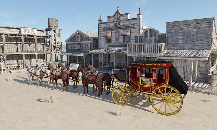 I hadn't noticed that the horses came with it. Here it is in front of Western Town. I also was playing around with stereo images last night so that version is attached as well (you need red/blue glasses to see). You can have 2, 4 or 6 horses. Has nine different coat colors and has a number of walking and galloping poses. Since this is an older set, it's display in Content Library isn't the best organized. It also loads with very high glossiness, specular, and ambient, so you need to tone those down.