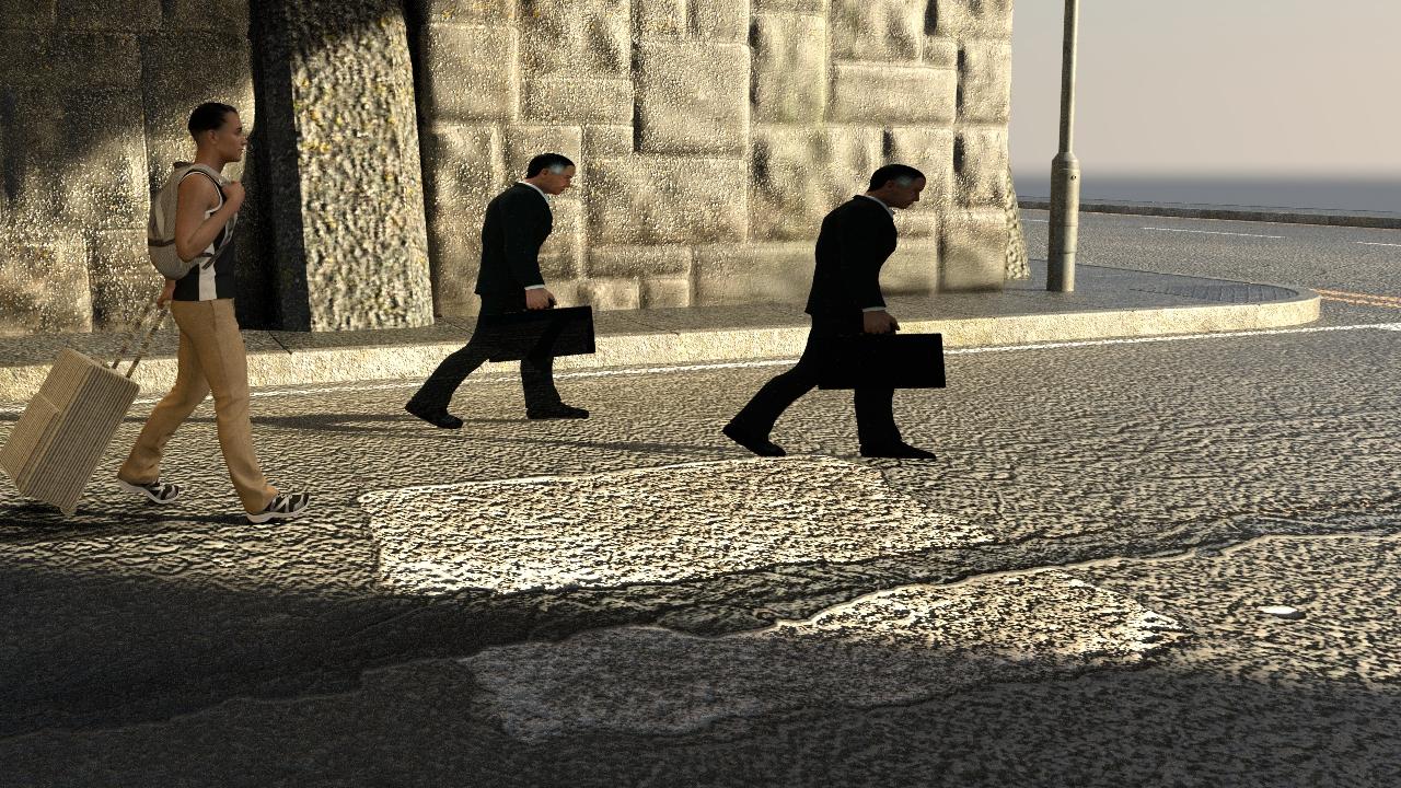 @fishtales Wow, that's a busy scene with the billboards! Looks well integrated. I got a giggle at the dog- he looks like HE is totally in charge, chilling, while all the people are wasting energy scurrying about. He's thinking, "What's the rush?" That, or he's looking down the street for the ice cream truck that always gives the dog a freebie.