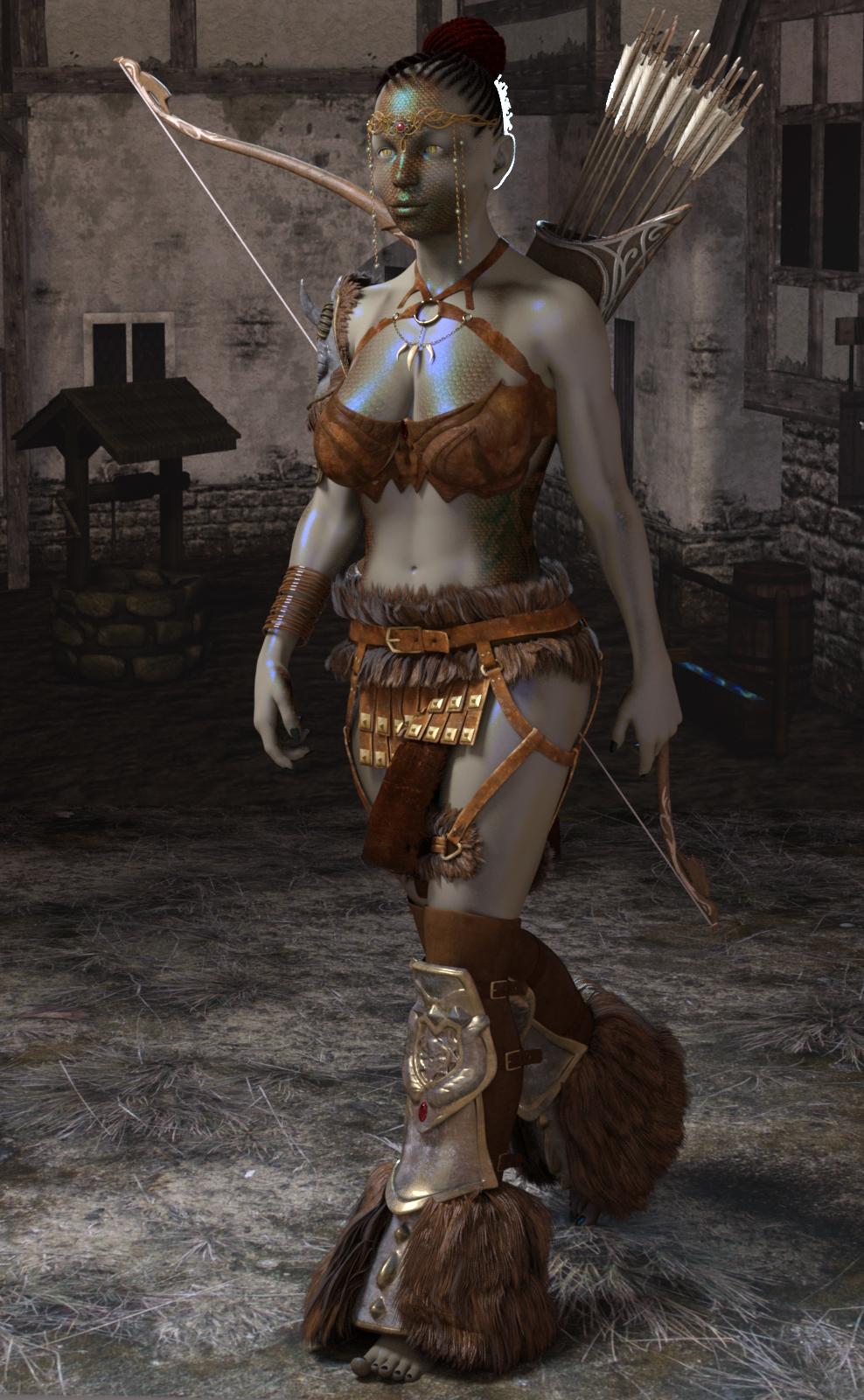 This character is G8F run through the randomizer, using the 200+ morph pack and add on as well a bit of she orc from Raw Art.  And then her skin is done using the Mutations snake option.  You can hide and show different parts of the mutated skin which makes it pretty versatile. This is the same characte but with two different skins under the geo shell. Please ignore her feet going through the ground, it was very late lol.  Click for full size, you can see the scales better.