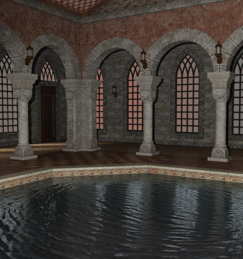 I then used the Surface Tool to slightly add gray to the columns and avoid losing details. The water renders nicely, for those of you who hate putzing with water this is again "out of the box) I had to laugh, I forgot and left the gray/pink background from the Sci-Fi Barrels, and it gave a nice glow in the background windows. Happy accident.
