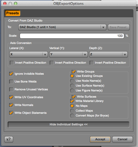 I want to play with making a custom morph, but I seem to have an issue with the Daz to Hex bridge. So in the meantime when I want to export a Genesis figure, import to Hexagon 2.5 for modeling, and then export it back to Daz, what are the proper settings in these dialog boxes? Whenever I get the Genesis into Hexagon, it is the wrong scale and the different groups are separate. For example, adjusting the vertices in the hip causes the mesh to separate along the hip/abdomen seam.