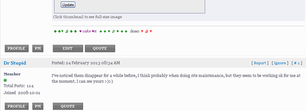 I've noticed them disappear for a while before, I think probably when doing site maintenance, but they seem to be working ok for me at the moment. I can see yours :-):-)