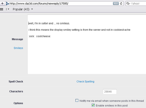 tried safari(pc), even IE(shudder), dayjob pc, home netbook, toggling enable smilies, toggling hide signatures