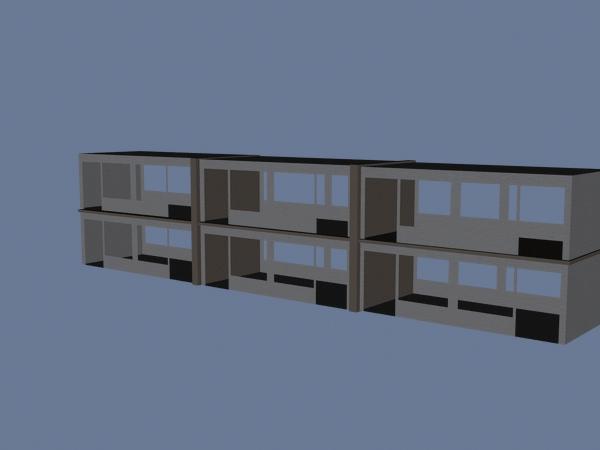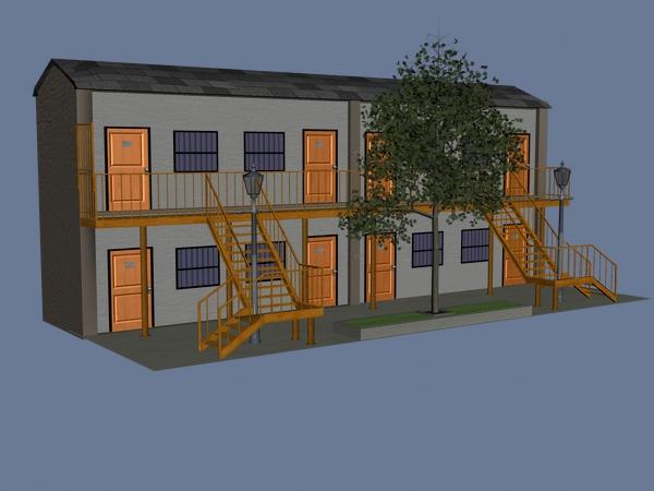 ...and finally completed. Changed the textures on the stairs to match the doors, and changed the street lamps to a nicer metal texture I found, which worked out accidently in how arranged itself on the lamp. Then added the tree from Urban sprawl (hopefully the rez is low enough to not give me trouble), and created the plant box.