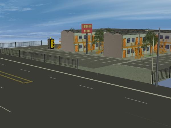 And finally the completed hotel, you don't get to see it enough in the video so here is the final layout. The buildings ALL done in Hexagon, as well as the sign, parking lots and the highway. The fence is from Urban Sprawl, and the hanging traffic light is MacLean, of course. I made it in to a 3 way light.