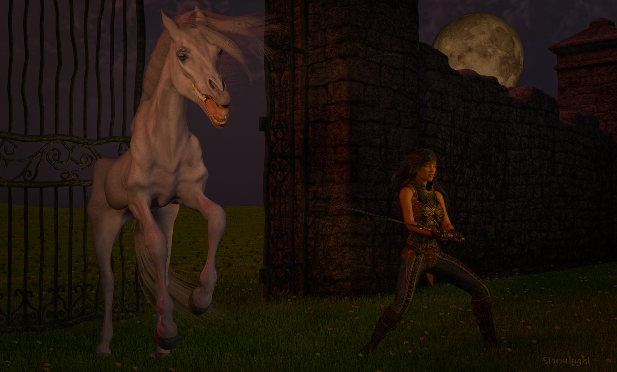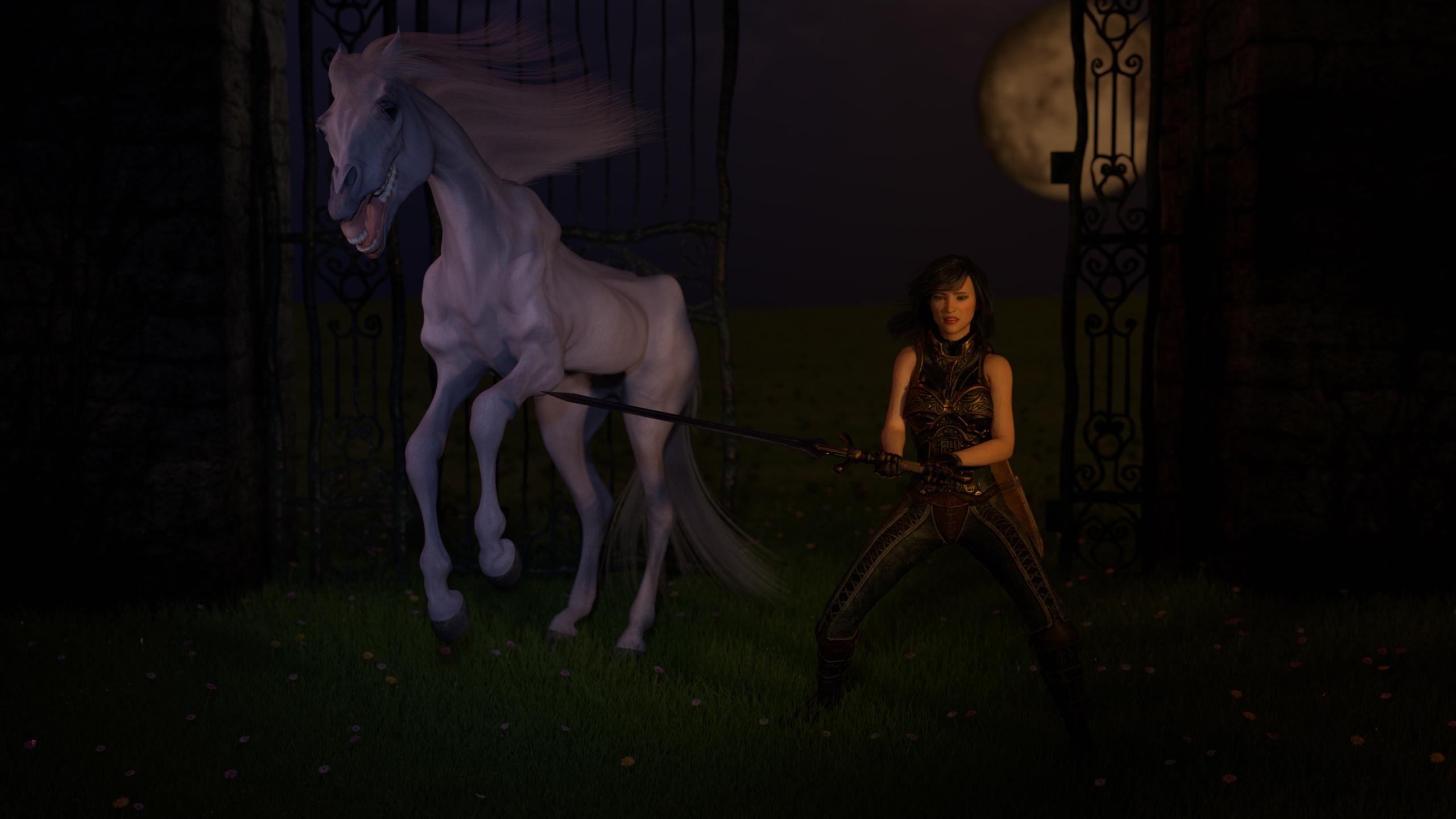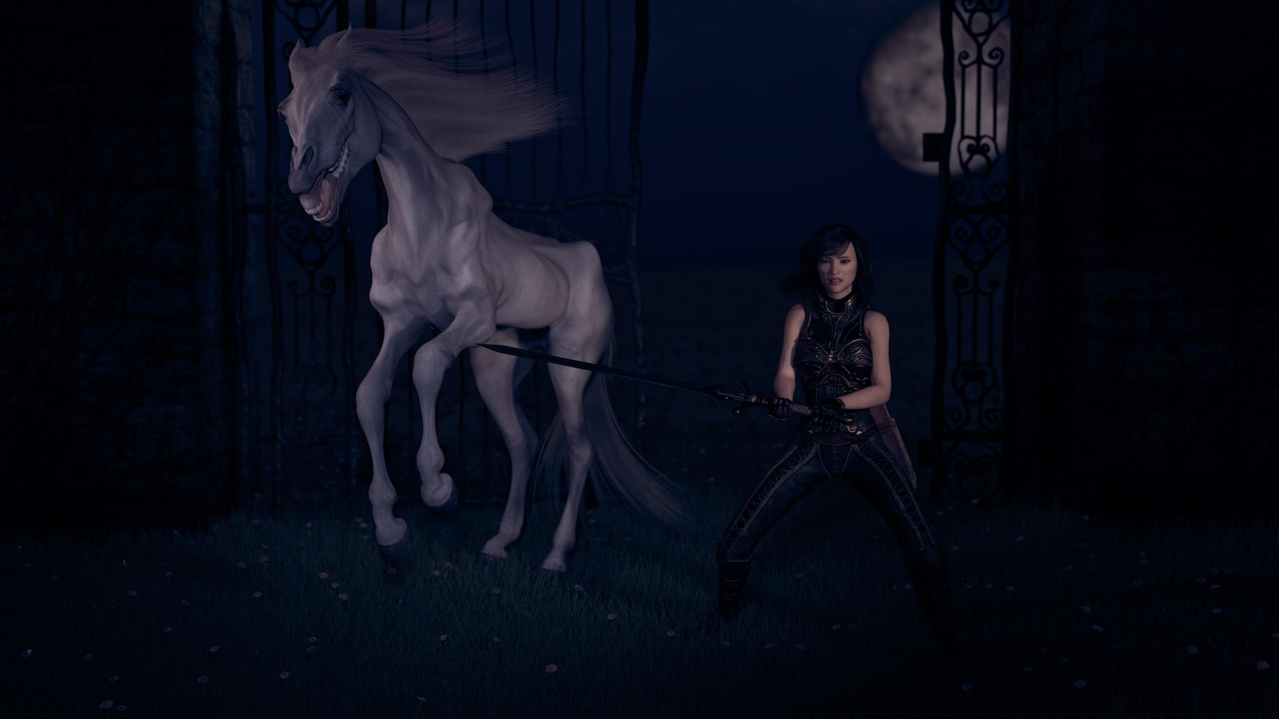 • I really like the moon showing over the castle walls, and this position is much better than stabbing the poor horse.  Although, it might not cause this particularly horse much damage lol.