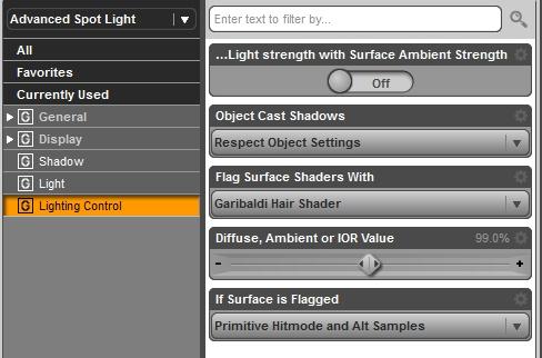 All the advanced lights have a lighting control group. There are drop downs that let you choose a variety of flagging options and a drop down of what to do with the flagged surface.