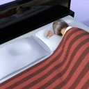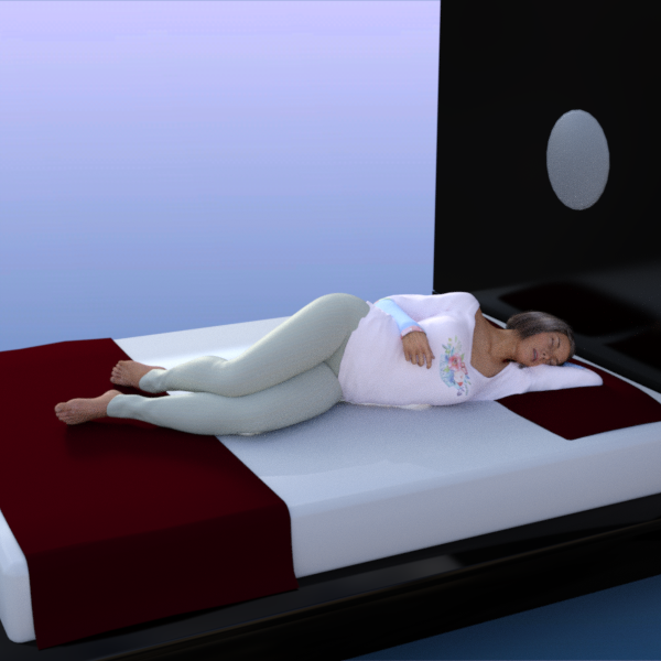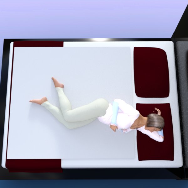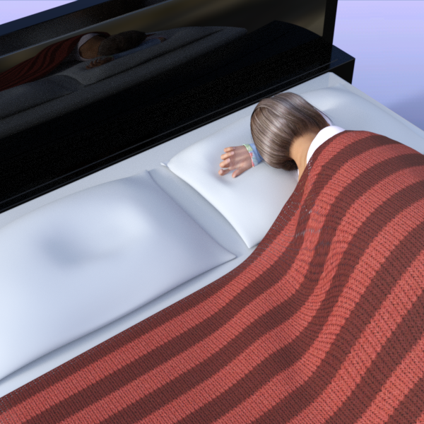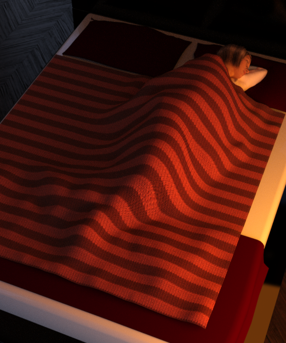 1. To setup the scene, we are going to use the bed from Modern Room Bedroom. It comes with a blanket at the foot of the bed and two pillows (combined as one prop) at the head of the bed. The actor is G3F in a sleeping pose with her left arm tucked behind her head. Originally her head and arm were flat with the bed, but I adjusted her chest side-to-side to lift her slightly so her arm is about half way into the pillow. Here’s how the scene looks to start: