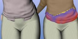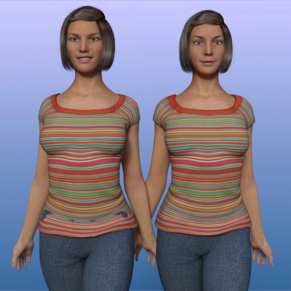 23. Where else can you use push modifiers? To adjust clothing so it fits better. Here’s G3F wearing the Summer Trend shirt. The lower front edge of the shirt is embedded in the body at several spots (see left figure). If your clothing item doesn’t have useful adjustment morphs for that problem, create your own solution by adding a push modifier. Choose the shirt in the Scene pane and follow steps 4-9. Leave the parameter setting in step 7 at its default of 1.0. You paint right on the figure and can see the change in real time. Here’s a screen capture of the viewport after a map has been added to the shirt on the right. You can see the front and sides of the shirt have been lifted free of the pants.