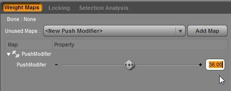 7. Half way down the weight map brush pane you will see a section titled Weight Maps. The Unused Maps box will show <New Push Modifier>. Click on the Add Map button.