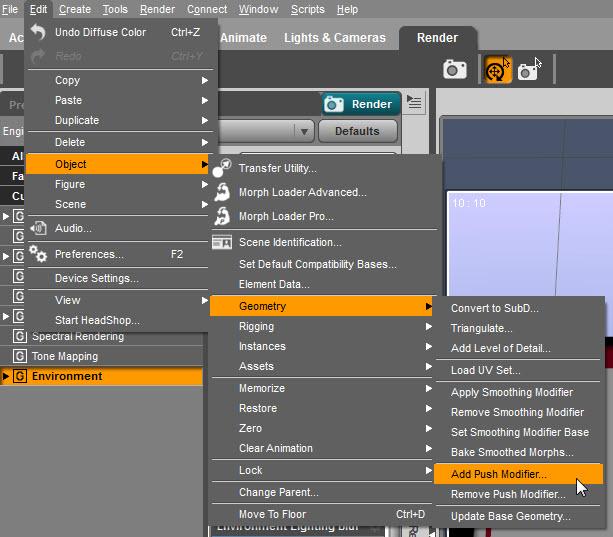 4. Select the plane in the Scene pane. Go to the main menu and select Edit/Object/Geometry/Add Push Modifier.