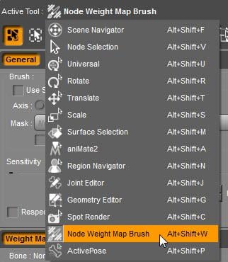 Go to the Tool Settings pane and from the drop down box at the top choose Node Weight Map Brush.