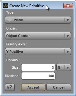 2. Create a flat plane by going to the main menu and selecting Create/New Primitive… and set the primary axis to Y-positive, size to 5 feet, and divisions to 100. The more divisions, the smoother the draping.