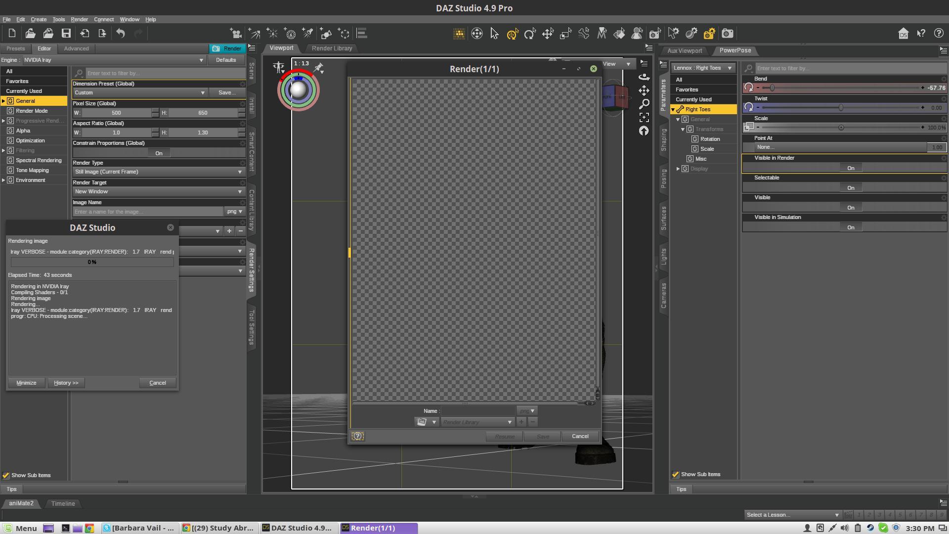 I've been playing around with my gf's Daz installation to evaluate its suitability for my movie project. I was able to assemble my first scene in a reasonable amount of time. My first takeaway: It seems that animation is Daz's weak point. It's a little tedious compared to other packages (granted the other packages aren't free) and Two: I have a lot to learn. So here is my first of many questions. I have attached my scene below. Is there an easy way to make the character's sword glow (like a light saber) inside Daz Studio? Are the camera settings connected to real life optics or should I just view them from the context of within Daz Studio? My background is filmmaking and I find the renderer's responses to the camera settings a little puzzling. But maybe it's because I am unfamiliar with the software. Finally (for now), is there a log file that provides info such as how much Vram a render is consuming and how long it took to render? This information is vital in planning for production of the final render. Thanks in advance for your help.