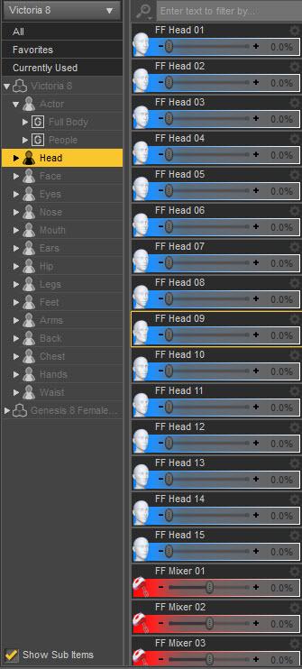 In the Content Library, under My Daz 3D Library / People / Genesis 8 Female / Shapes, you will find the presets for the partial face morphs. The presets don't have descriptive lables, they are just numbered. The thumbnails are overexposed, so it's hard to see the detail. There is no zero morphs preset, so you have to use Undo to remove it.