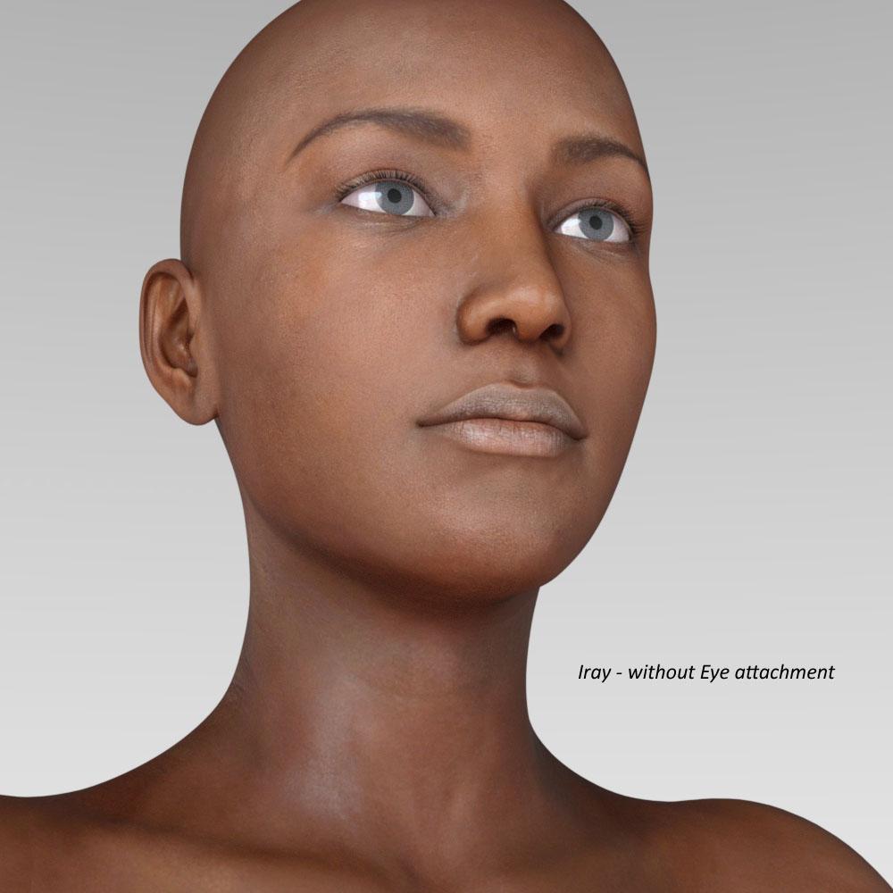 The Script detects that the Shader is Iray, so it sets the Opacity of the Geograft Eye attachment ("Cornea Legacy" and "Sclera Legacy" surfaces) to zero, and resets the Iris to default size.  This is an Iray render of the result: