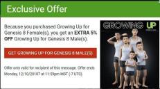 Well, I just got a message that I get a whooping extra 5% off for buying Growing Up for G3F WOW!  And this after earlier offering it for $1.50 less than the new discounted price. Thanks but NO THANKS! Happy Holidays Bah Humbug,.