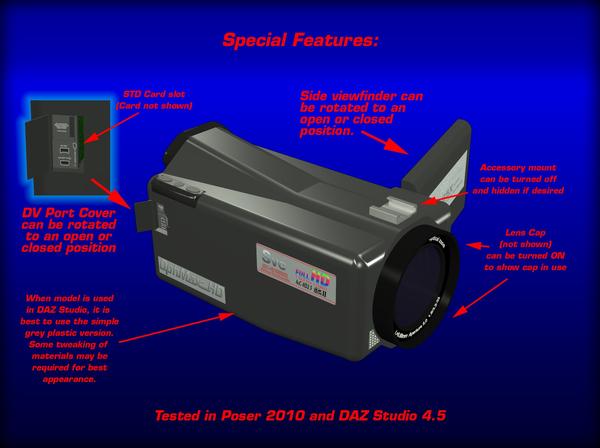 Tested for Poser and DAZ Studio, works in both... looks better in Poser. Working features include a folding side view screen, opening DV port/STD card slot cover, and parts that can be hidden or turned off if needed. Extras Include 3 types of STD memory cards, 2 types of Lithium batteries, and an extra lens cap.