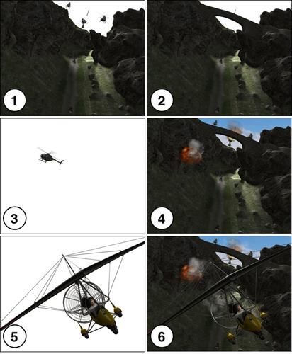 Now I group items into layers, base layer first, and then the second helicopter (slamming into the wall in a separate group, and Bond in the last group. Now In rendered the background scene without the smashing copter and Bond, but with the bridge opacity set to 0% (1), saving it as a transparent png. I now hid the copters and set the opacity of the bridge back to 100%, and rendered again to another png (2). Now I hid everything exceot the smashing copter, and rendered to .png again (3).