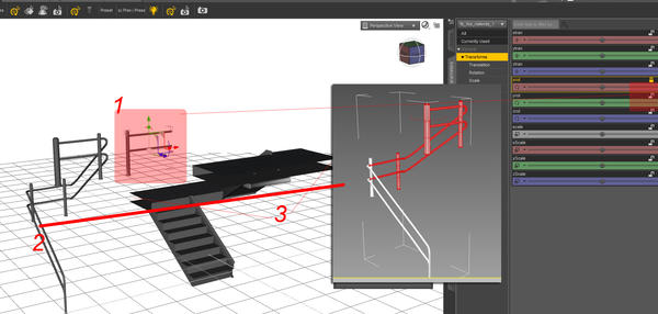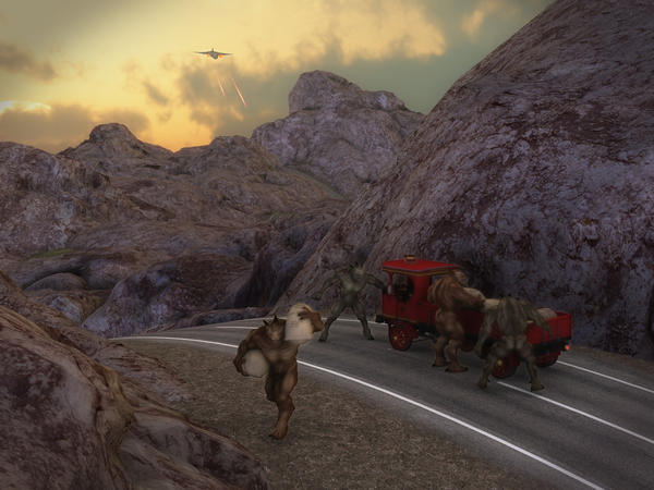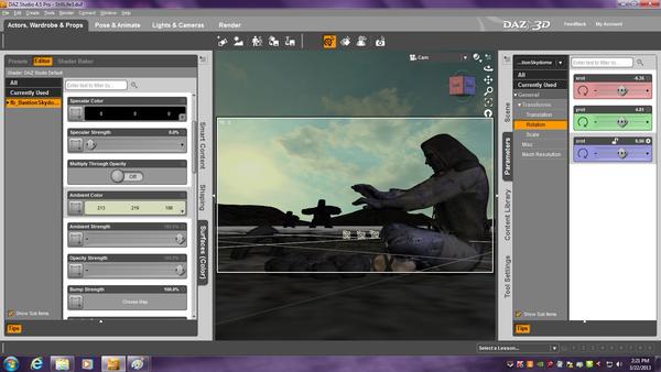 I chose not to use the included lights or cameras that came with the set, and to alter the sky texture a bit. One of the images below shows the screen from Studio with the sky settings open; it's hard to tell but the ambient color was changed to a very pale yellow instead of the default light, and then darkened just a little on the grayscale. I rotated the sky on all three axes to get the sun into the position I wanted, and where the clouds made a nice balance and slightly skewed angle in the sky.