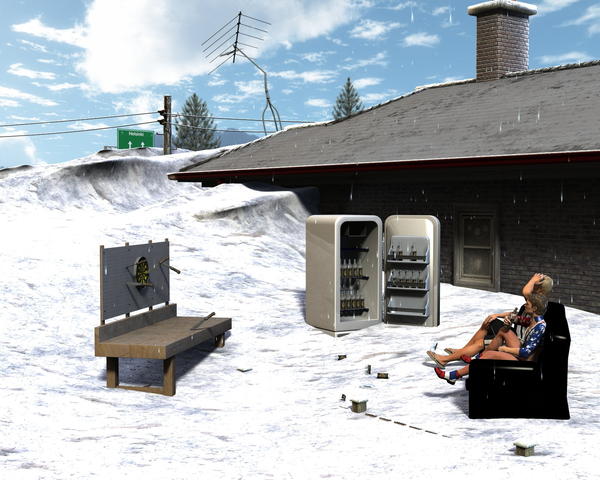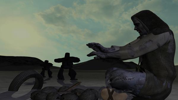 This was a render I'd had in my head for a while, but hadn't got around to doing. The idea was pretty simple...a frozen dead guy next to an old campfire. I used FirstBastion's set, along with the included skydome and Inukshuk rock formations. I chose tattered looking clothes for the figure, and applied an overlay shader from hybrid grunge to make the shirt look more ripped. For the character's skin, I chose a genesis zombie texture as it looked about right for a frostbitten corpse, I thought.