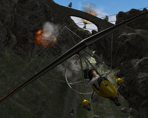 At last I only had Bond visible and rendered once again to a .png (5). I Now opened the exported image in Photoshop, and opened Bind, and used a quick FilterForge filter I tossed together to slightly smooth the transparency mask to avoid too sharp edges when blending Bond on top of the background. I also used some of Rons Smoke brushes and added some additional smoke and dust to the image, and gave it a little blur. I then added the smoothed James Bond in the ultralight on top, and the image was done.