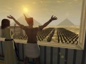 render that out and use it in a scene with your figures and some buildings,. even a simpler smaller terrain,.. or a "shadowcatcher" shader on a plane,. for the ground.