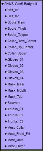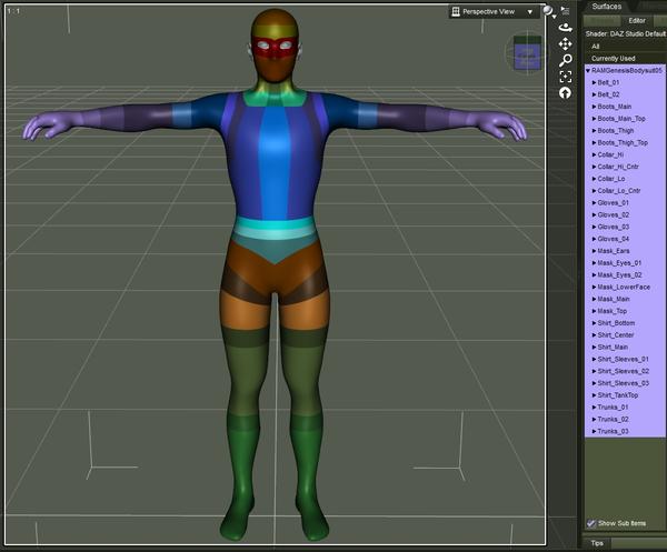 SO created what I'm calling the "Simple Suit" which is no feet, hands or face. A separate Mask with zones to turn on/off. 3 sets of gloves, one simple set of gloves, 4 sets of boots with sock, flat or heeled options. Been playing around with the Panel Loops and having a blast.