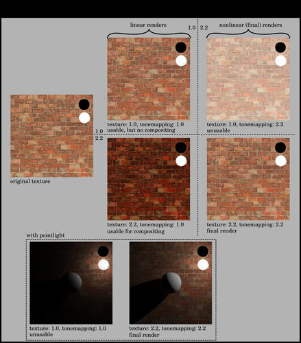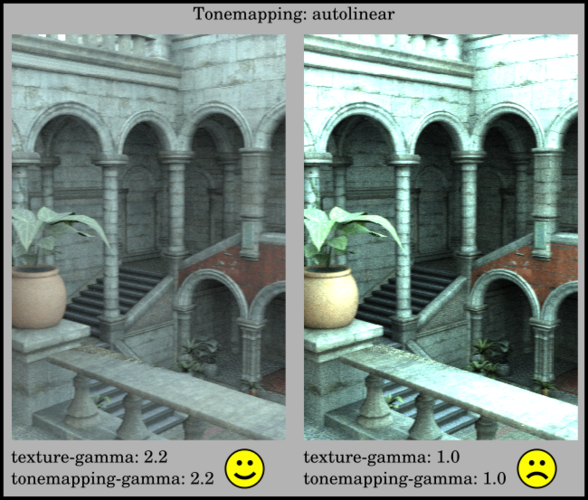 So the two images (texture/tonemap gamma both 1 and texture/tonemap gamma both 2.2) look identical in this example. However, they only do because of i used a single distant light. In the lower two images i added a single pointlight instead of the distantlight, (invisible; above the white spot) and a white matte sphere in the center, and now the images no longer are the same. The image with the gamma 1 (left) is much darker than the image with the 2.2, while the colors of the textures are still alright.