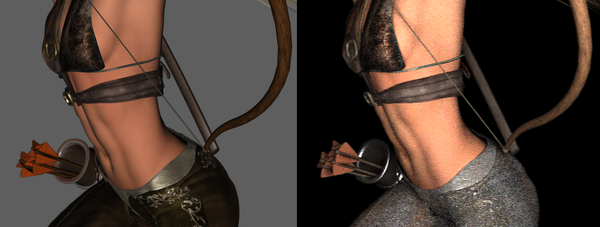 Thanks, but the whole image looks great except for the pants and gloves. (i.e.skin, hair, shirt, weapons, etc) Wouldn't render settings affect the whole enchilada? I've used Luxrender with Reality and Pose2Lux so I am pretty good with it. Not sure how a change of render settings in Luxrender changes one or 2 materials in the scene? Then again, I am no expert, so I am willing to learn! I'll poke around in it.