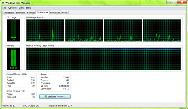 The CPU's an AMD Athlon II X4 645, 3.10 GHz, quad-core. There's 6 gig of RAM. I rebooted, then only used DAZ Studio to load and start rendering the scene before closing it, so aside from the usual background LuxRender's the only thing running. From the screenshots below you can see that the CPU's barely touched, but its memory usage is almost total.