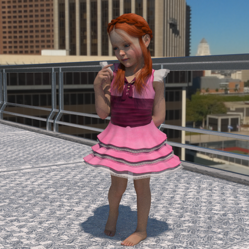 Just a pretty simple two-light setup. An UberEnvironment light for ambience and a single distant light. The UE was tinted pale blue, while the distant light is tinted pale yellow. The result is a nice colour-balanced image which still gives a nice warmth to the sun. I had to model and texture the ice creams held by Sam myself, since I couldn't find a decent cornet-style ice cream prop anywhere.