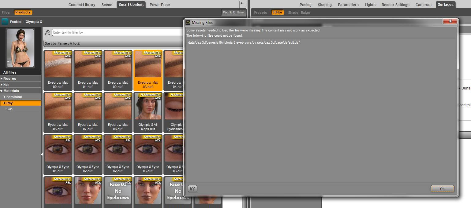 I load the Olympia 8 eyebrow prop. Then I select it and go to apply one of the eyebrow mats. See attached screenshot for the error message I get. Apologies, it's not so much "Victoria 8 UVs", as it is UV sets that are located in Victoria 8's folders.