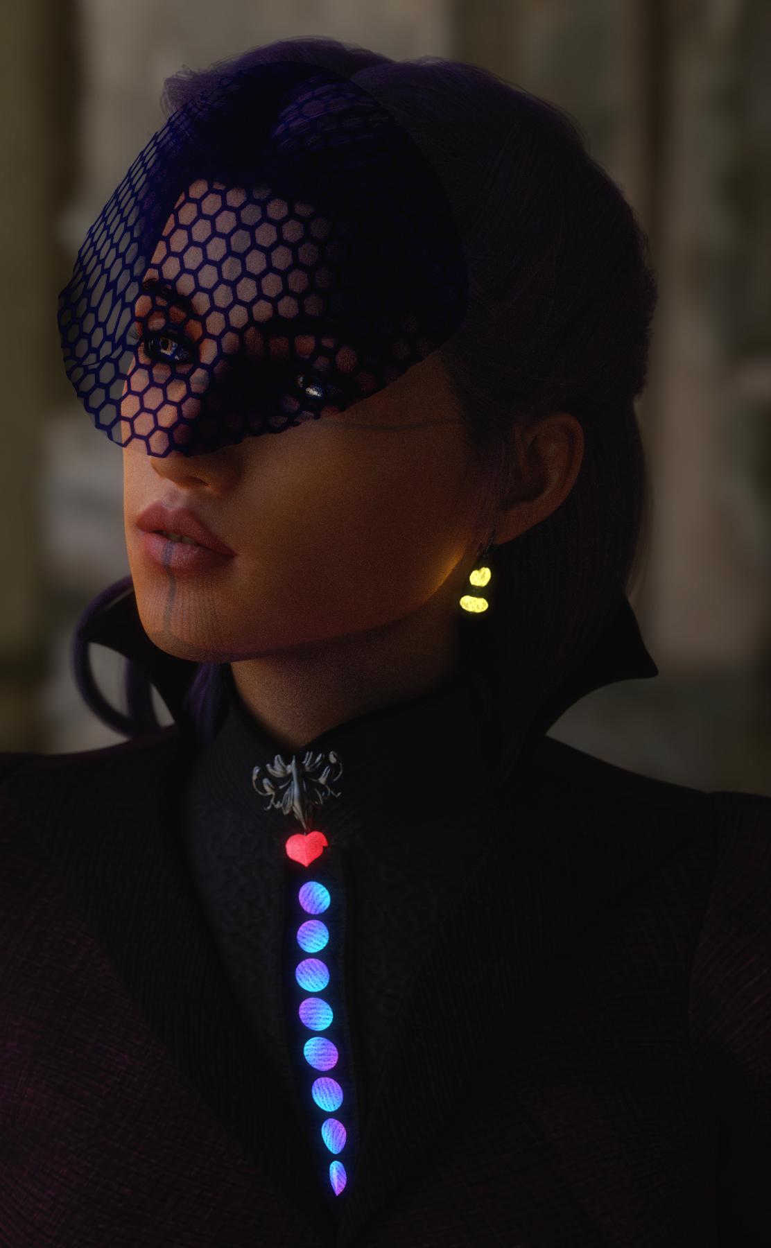 In this I set the veil piece to Hive blue, with a negative 20 luminance. I like the way it turned out but I'm unhappy with the placement of the veil itself - I'll have to find a better headgear than the Galactic helmet I'm using.