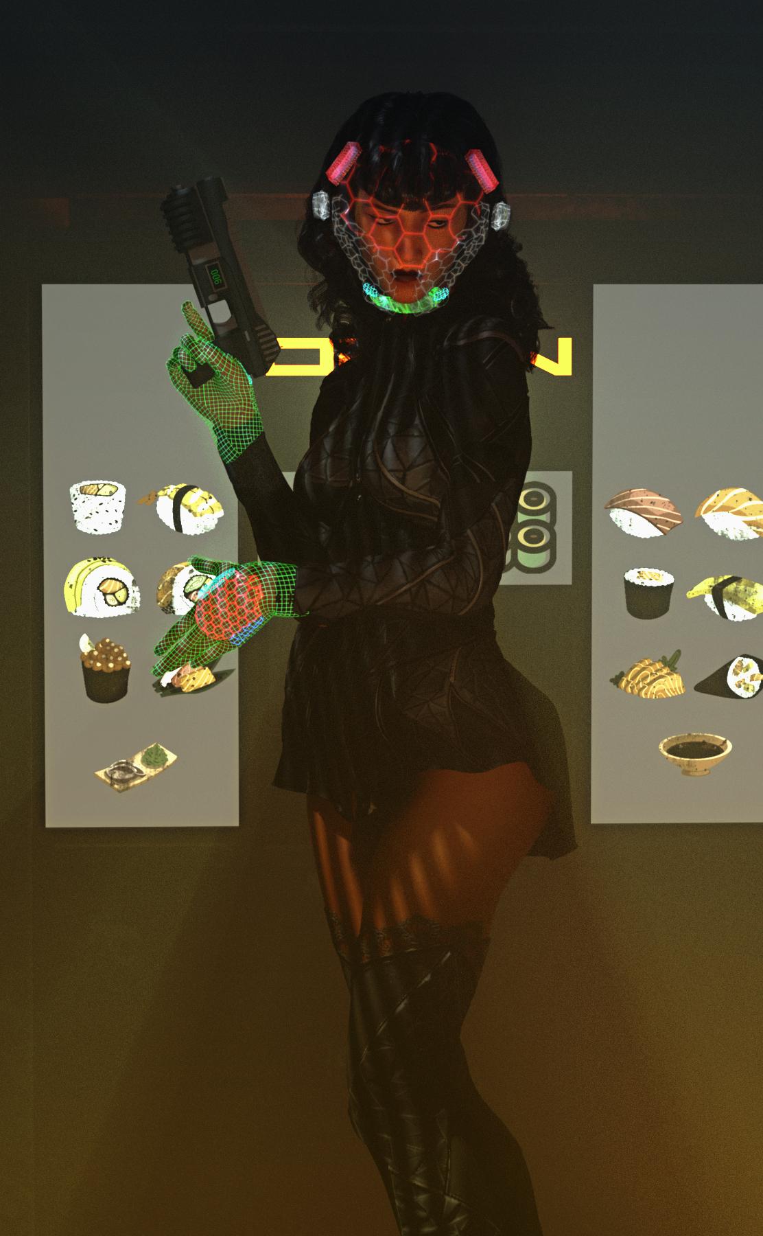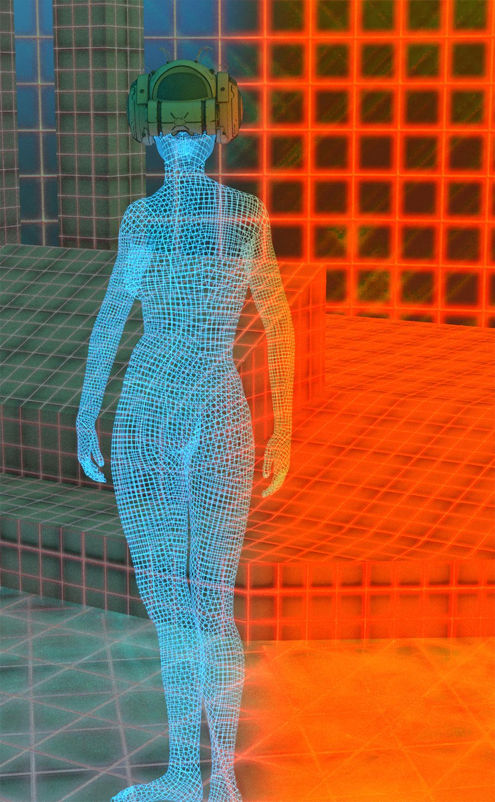 I really love these shaders. I put together this, using a spacesuit helmet and gloves to give the effect of an augmented agent of some sort. I love the effect of the red lattice over Priya's face, like a veil. I wonder if I can set that lattice to black (or negative lum?) so its more like a film noir veil along the lines of Lauren Bacal in The Big Sleep?
