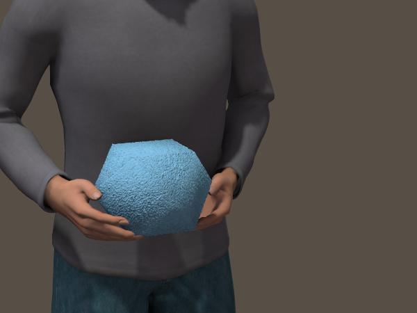 To get the sharply defined facets without beveling, just access the block's "proprties" and reduce the "crease angle" to something around, oh, 32 degrees. I'd also scale down the overall size just a tad. Remember, Rojan could grip the the underside of the block in one hand.