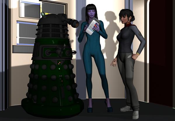 Anyhow, here's 2 practice shots, one of the ship's top officers having a mini meeting: 1st Officer Zeg, Science Officer Cassy Morrison, and Captain Nozaki. The captain's actually based upon somebody that I know.