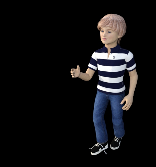 I managed to find my old toothless 8-year-old character, "Trotwood McAllister." As before, I just loaded the file "trot4.daz." and he appeared in his polo shirt, jeans and untied shoes. I wanted him in the overalls he often wears, but can't find them.
