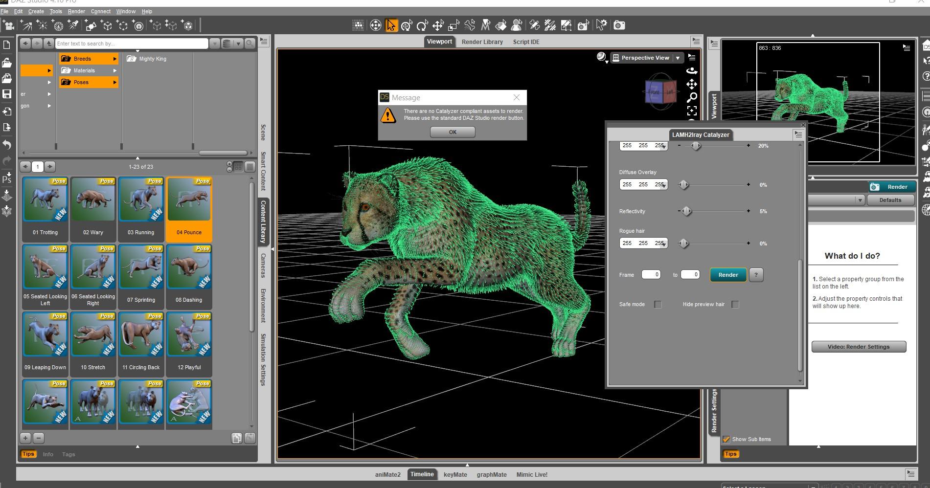 I just purchased the LAMH Catalyzer and I have the free version of LAMH, but every time I try to render with the Catalyzer I get the message, "There are no Catalyzer Compliant Objects to Render. Please use the standard Daz Studio Render Button" I am using Alessandro's LAMH wolf and fox and neither has worked. Before I started I put in the serial number and restarted the program and still nothing. What exactly am I doing wrong?