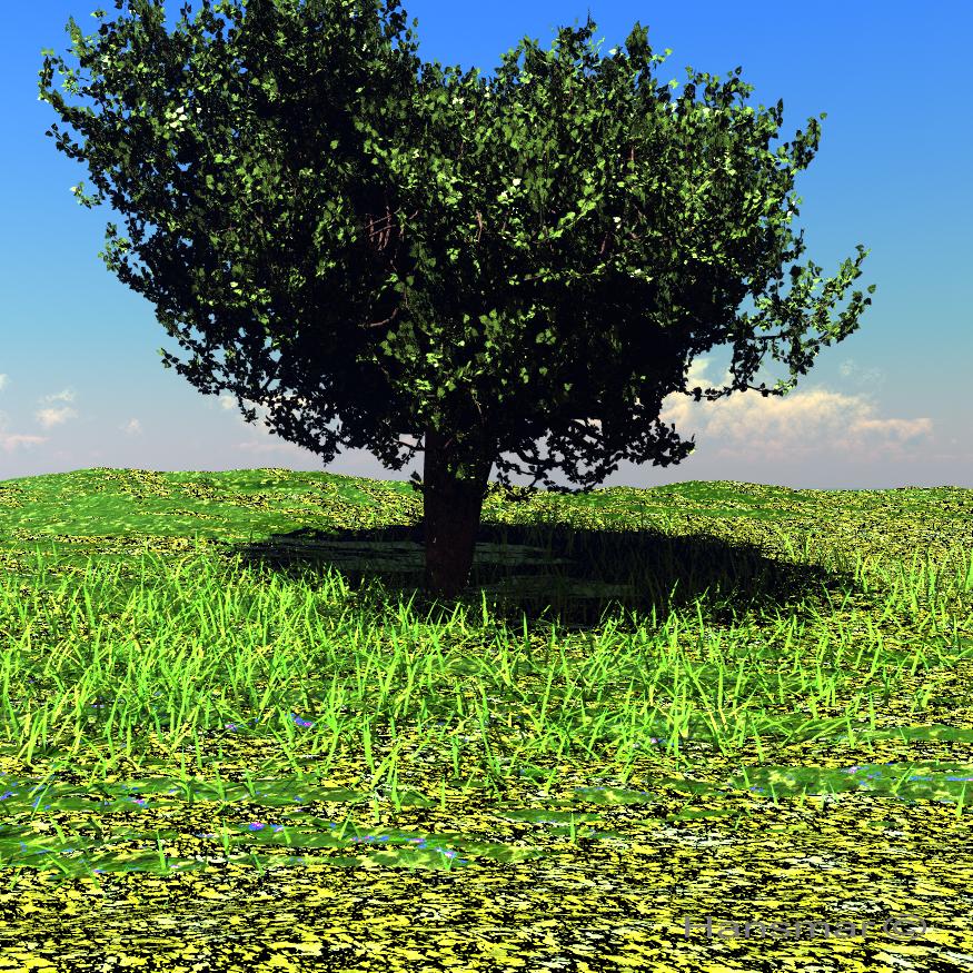 1. Blend transparency. Importing a leaf image onto a plane (such as Bryce does) is only 1 way of applying leaves. While this might seem like a no-brainer easy solution, but it is actually a terrible idea for anything other than the simplest scenes. Blend transoparency plays terrible tricks on the shadow ray calculations, and in situations of complex scenes where individual rays might find themselves traversing muliple blend transparent surfaces on the way back to the camera's eye can lead to horrifying render times. People who rely on blend transparency for leaves are extremely limited in the lighting options they can apply, as anything other than the Bryce sun and ambience glow will cause huge extended render times.