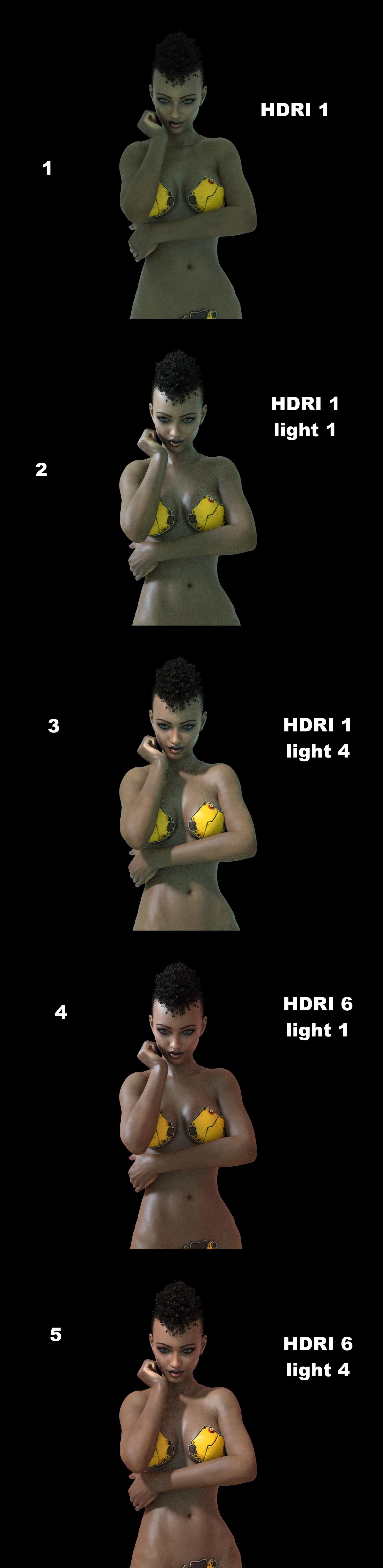 I would say the "lights" are to be used as fill lights for close-up renders in combination with the HDRIs. You can see the problem with this on the main product image with her left upper arm lit from more than one direction. Much like in lots of films where people cast two ground shadows. It kind of defeats the idea of HDRI lighting. The props aren't inclided in the product, just the lights.