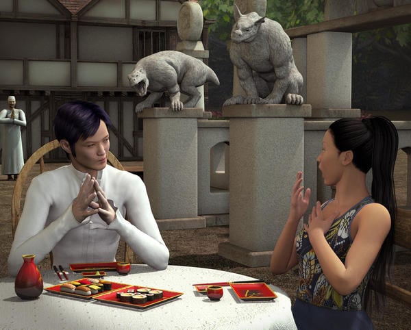 Natsumi's new boyfriend took her to eat "the best sushi ever" on April Fools Day. He was very amused to see her alarm when she heard growls coming from the stone Gargoyles.