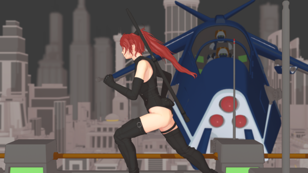 kChan will remain in the center of the screen and she'll be in a run cycle for all 4 seconds. The catwalk will be animated to move from camera left to right at a rate that matches the tempo of her strides. The skyscraper layer will be pulled the same way but at a much slower speed while the background/skyline layer will remain fixed. The independent rate of movement of these layers combined with escalating levels (FG to BG) of de-focus via Gaussian Blur will enhance the forced-perspective/pseudo-DOF effect common in Anime.