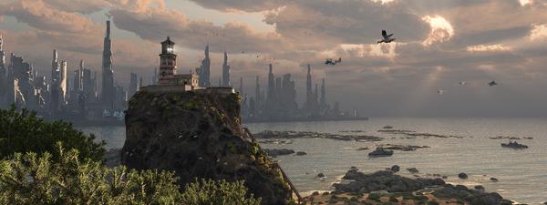 Nicely done Pete. I like the mix of futuristic city in the distance, and an old fashioned lighthouse in the foreground. I never would've thought to mix the two. :coolsmile:
