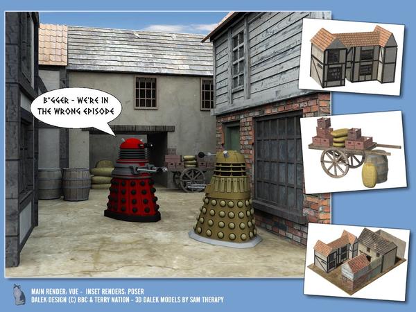 I saw these and thought would it be possible to make a model from such a source, and it is :) It contains 4 'Houses', a fully loaded cart, barrels and sack piles. All in .PP2 prop format, and as with most of my freebies will work in Poser, Studio, Carrara, Vue and most 3d apps.