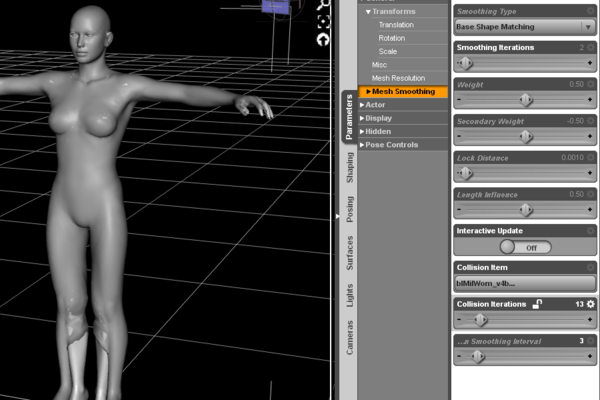Poi vai sulla finestra dei Parametri e selezioni Mesh Smoothing. Ora dipende un po' dalla versione di DS che hai, ma dovrebbe esere possibile aumentare Collision Iterations a 11 o 12 (per ottenere un risultato passabile con V4). Se non succede nulla, dovrebbe appparire una barra di progresso in basso allo schermo sulla riga scura, metti Interactive Update su On.