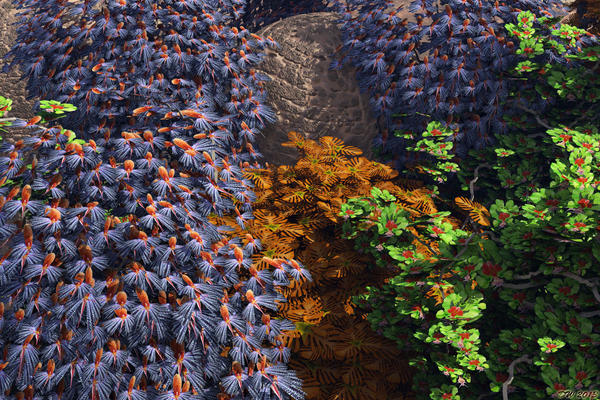 When I was applying the leaf texture I wondered what SpaceBones Alien Leaves (from ShareCG) looked like on the Ivy. I had to rotate the image 180 degrees and I also had to create a custom alpha trans map because I have to go through the DAZ Studio bridge to get images into B7 (Mac B7 won't read images and D|S doesn't read SpaceBone's PNG transparency). Three separate Ivy generations each with a different Alien Leaf. Top and side images. Not great but thought it was kinda cool looking. Rendered with TA about 3 hours to render @32 RPP.