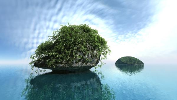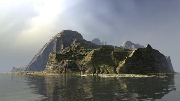 Horo's HDRI backdrop and light source + Bryce sun. Island shape made in Wings3D. Five trees with their roots made invisible (so you can't see them sticking out of the rock). Trees excluded from HDRI lighting and the infinite light pointing up at the bottom of the rock (to give the impression of light reflected off the water surface). Some transparency on leaves - a trick poached off Rashad Carter. And a bit of carefully channeled ambient light so the shadows don't get too black.